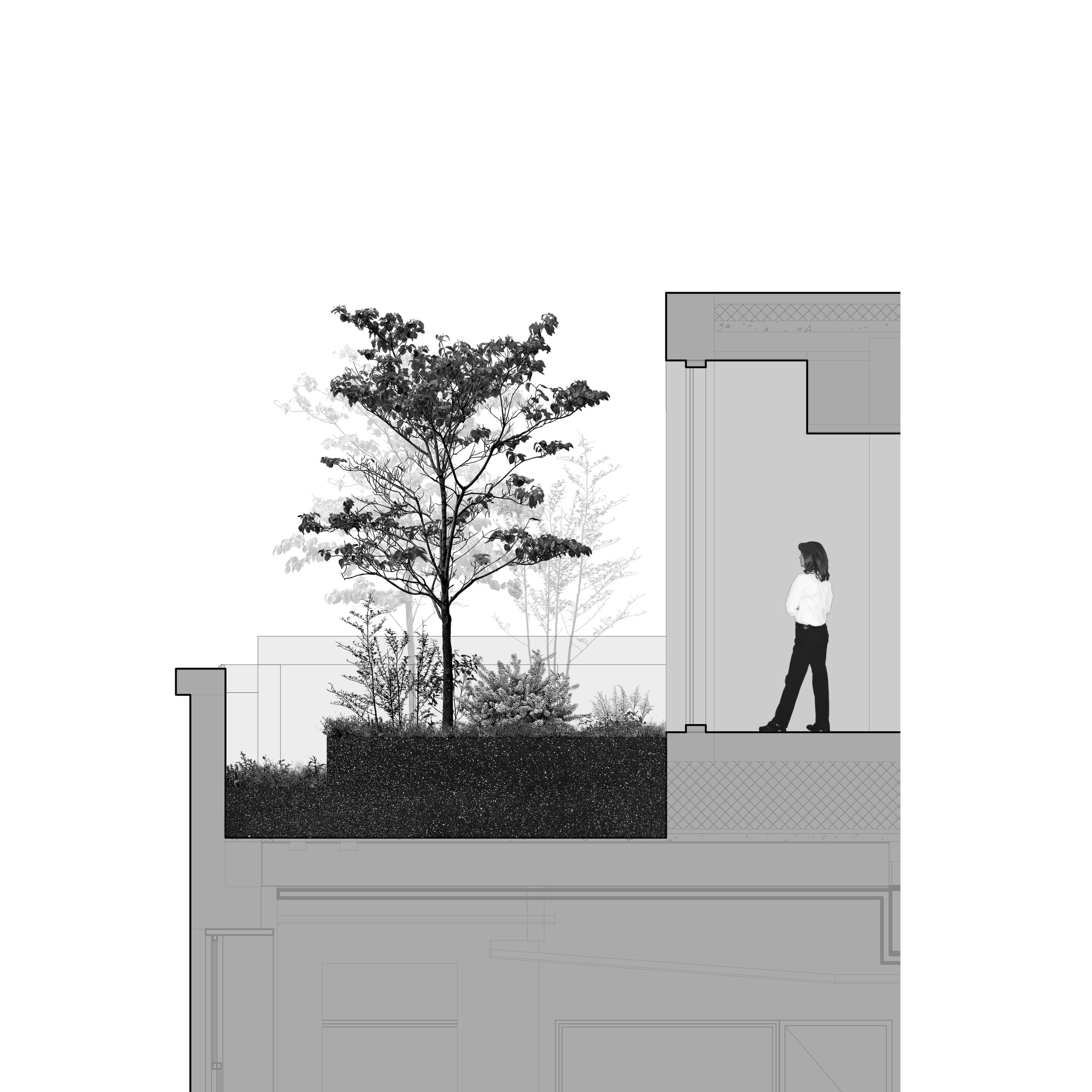 The design of the Academic Roof Garden imagines a roof garden as an extension of the interior spaces of a rooftop addition. Layers of shrubs and small trees add depth to the view above the formerly industrial rooftops of Soho.